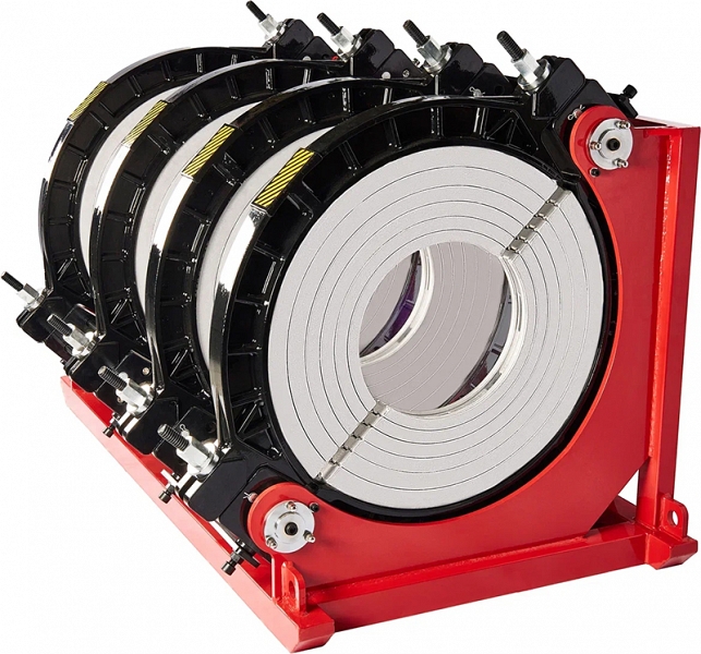 - Центраторо с гидравлическим приводом и 4-мя прочными широкими зажимами, один из которых легко может быть удален для облегчения сварки полимерных фитингов с трубами (тройники, крестовины, отводы), имеет большой запас прочности за счет качественного сплава и ребер жесткости, что позволяет сваривать полимерные трубы с любым показателем SDR