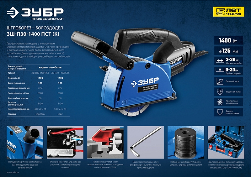 Преимущества штробореза Зубр Профессионал ЗШ-П30-1400 ПСТК: